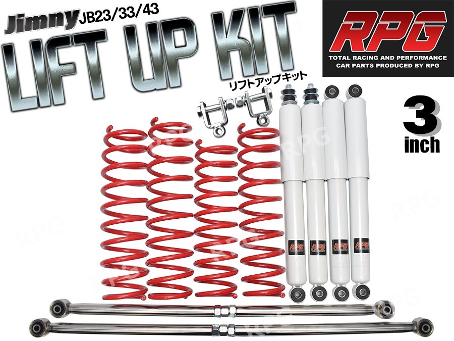 > ジムニー JB23/JB33/JB43 3インチ リフトアップキット RPGロングショック白 ステンラテ コイル赤 リア用ショック延長ブラケット付き