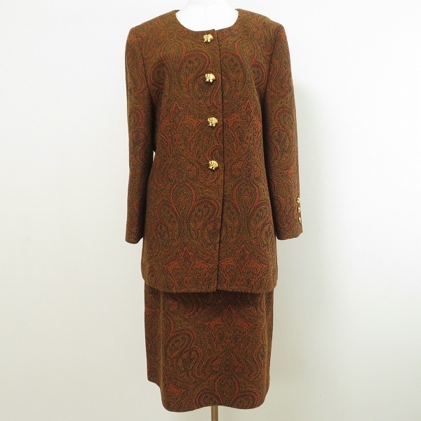 > #wnc レリアン Leilian スカートスーツ 13+ 茶 オレンジ ツイード ペイズリー 金ボタン ノーカラー ゾウ 大きいサイズ レディース [965605]