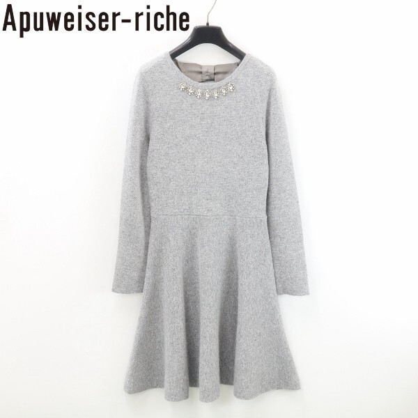 > 【KA364】美品◆Apuweiser-riche アプワイザーリッシェ リボン付 ビジュー装飾 アンゴラ混 ニット ワンピース グレー 1