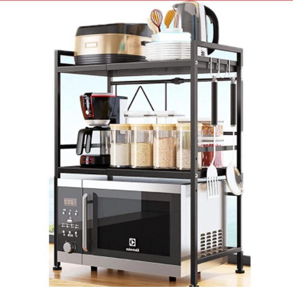【3段式レンジ台】 電子レンジラックは3段式で、 上に色々な調味料、キッチン家電等が効率よく収納できます。