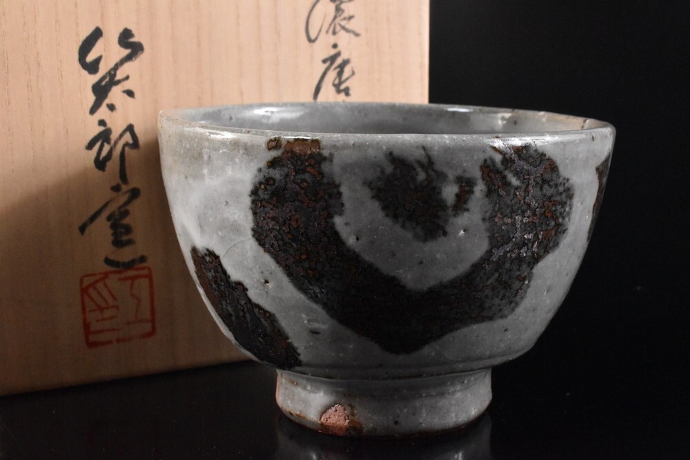 - 【雲】某名家収蔵品 美濃 灰釉模様絵付抹茶碗 在銘 共箱 古美術品(茶道具) F8465