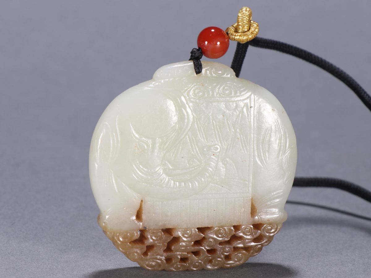 - ▽鴻▽ 清朝時代 和田玉彫 太平有象掛件 時代物 中国古美術 骨董品