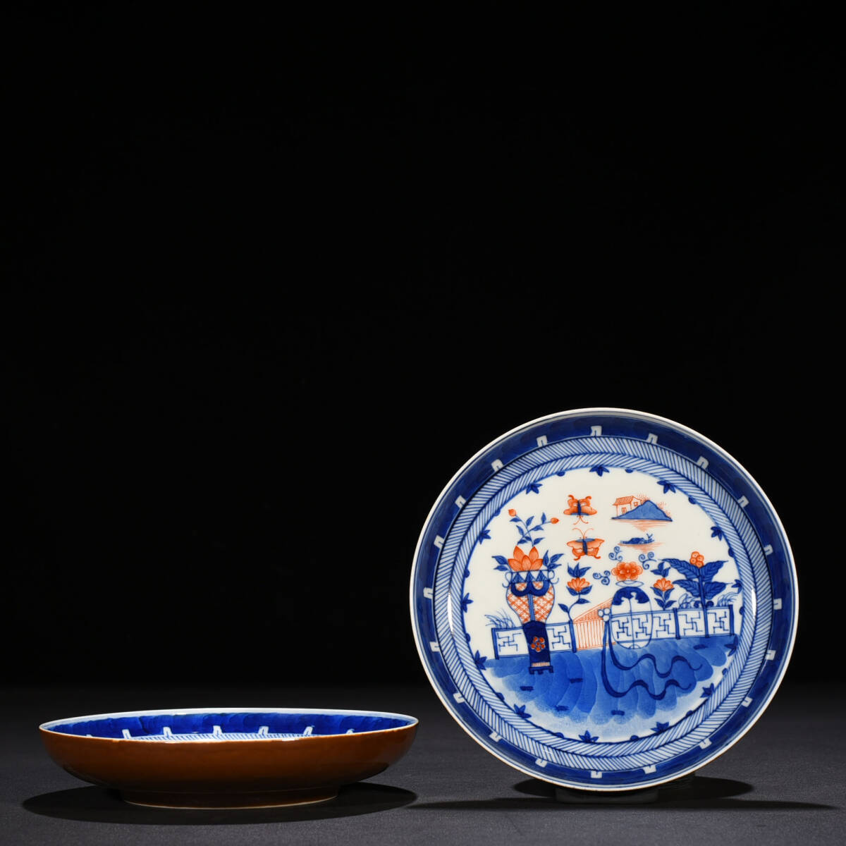 - 清時代 康熙 紫金釉 青花 染付 礬紅 花卉文盤 唐物 箱付き 陶磁器 中国美術 古美術 置物 骨董品 H93