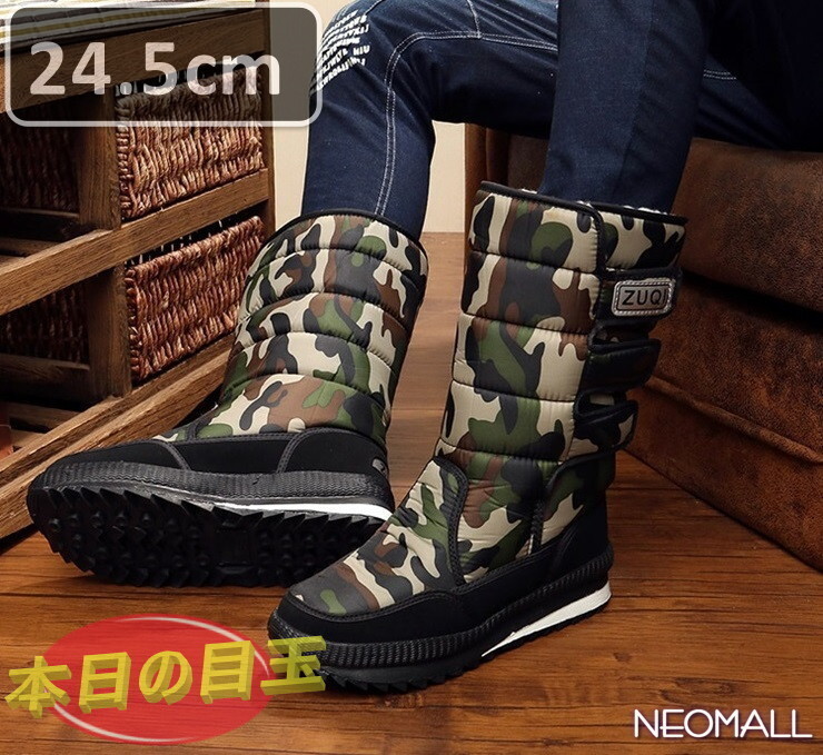 - メンズ スノーシューズ 【866】 24.5cm グリーン迷彩 ムートンブーツ スニーカー ウィンターブーツ 裏起毛 防水 防寒 防滑 冬用靴 綿靴