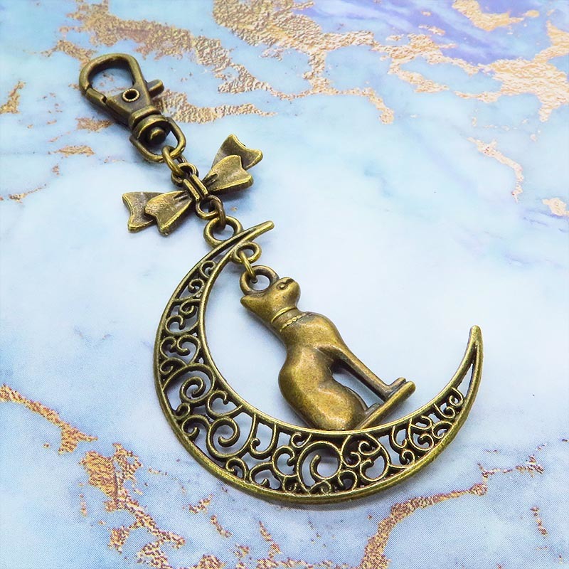 - 猫の神様 アンティークゴールドのバステト神と透かし三日月の大人可愛いキーホルダー ムーン リボン 金具変更可