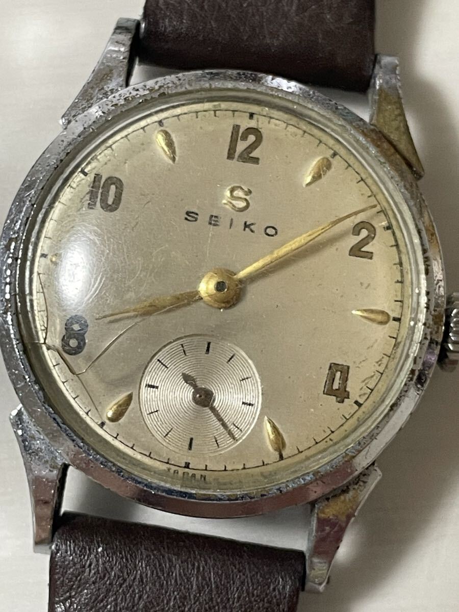 - SEIKOセイコー 本物 超ヴィンテージ 11020 手巻きモデル スモセコ 焼けシルバー文字盤 飛びアラビアインデックス メンズ腕時計