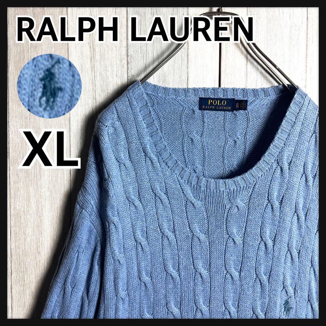 > 【現行・XL・美品】POLO RALPH LAUREN ポロラルフローレン ポニー刺繍ロゴ ケーブルニット セーター くすみブルー 青 水色