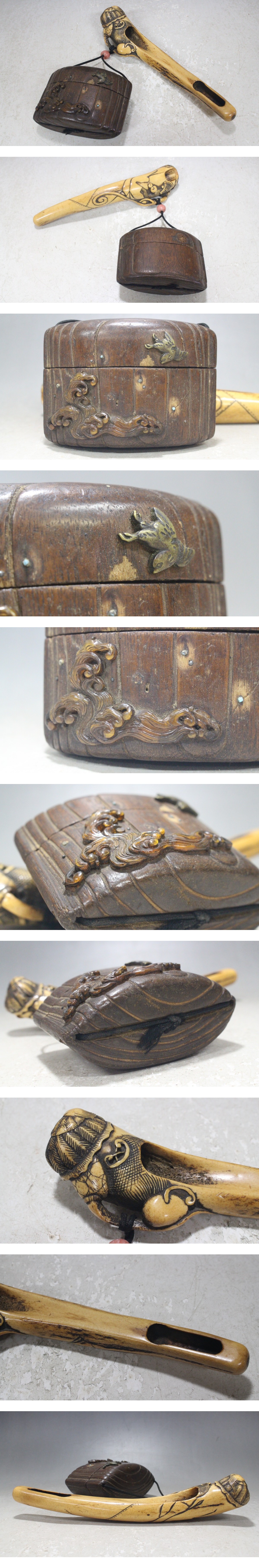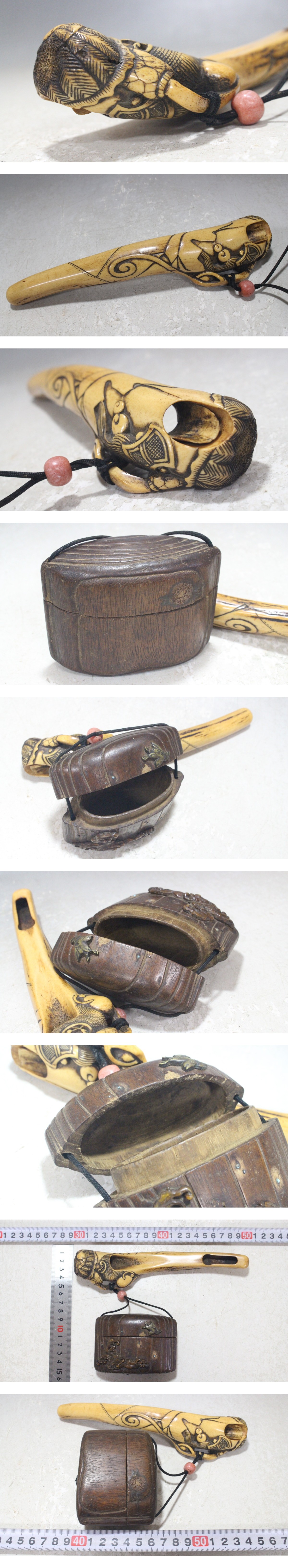 - 胴乱 (約145g) 鹿角 煙管入れ 提げ物 時代物 根付彫刻細工 ツ42