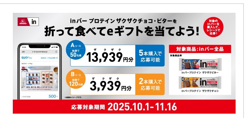 - 懸賞 応募 inバープロテイン クオカードPay 3939円分 当たる レシート
