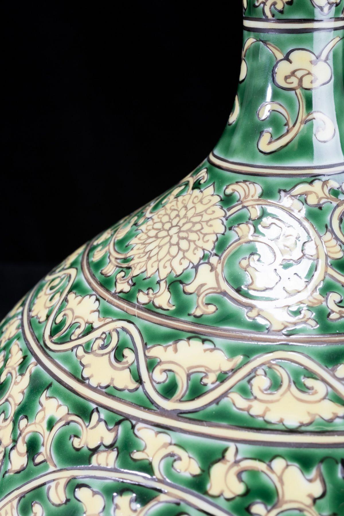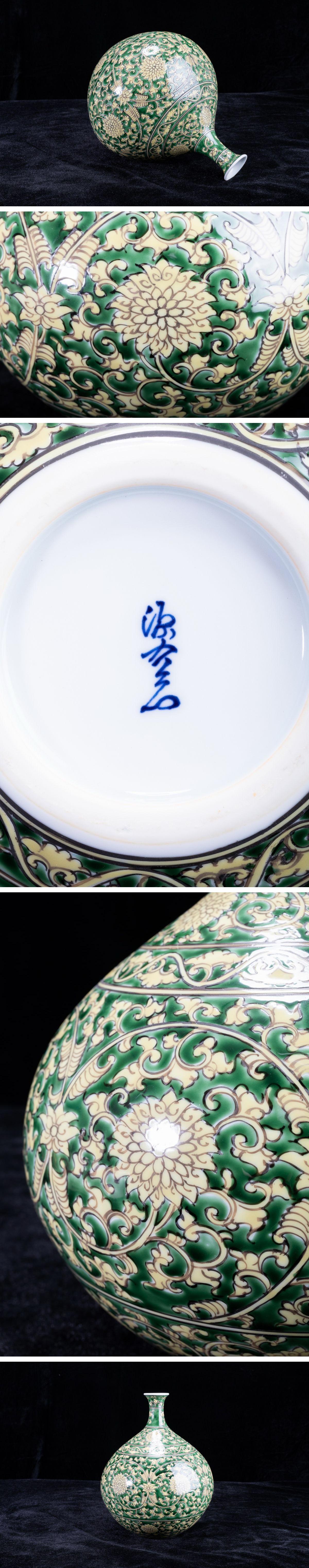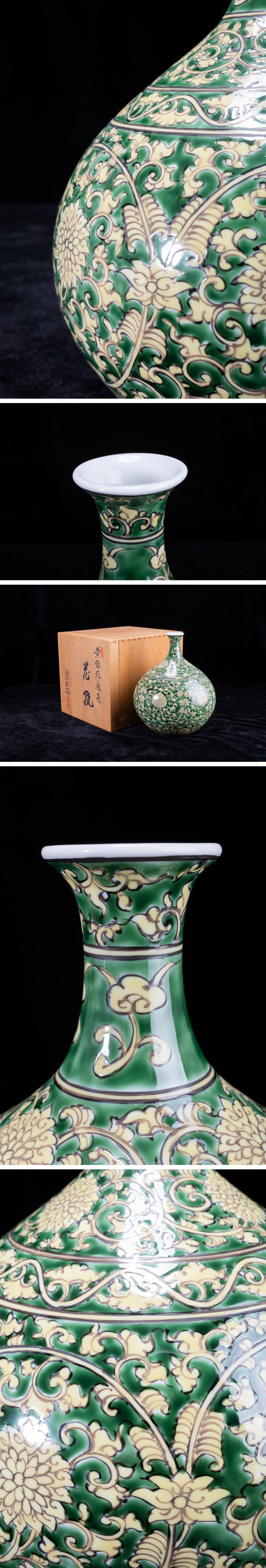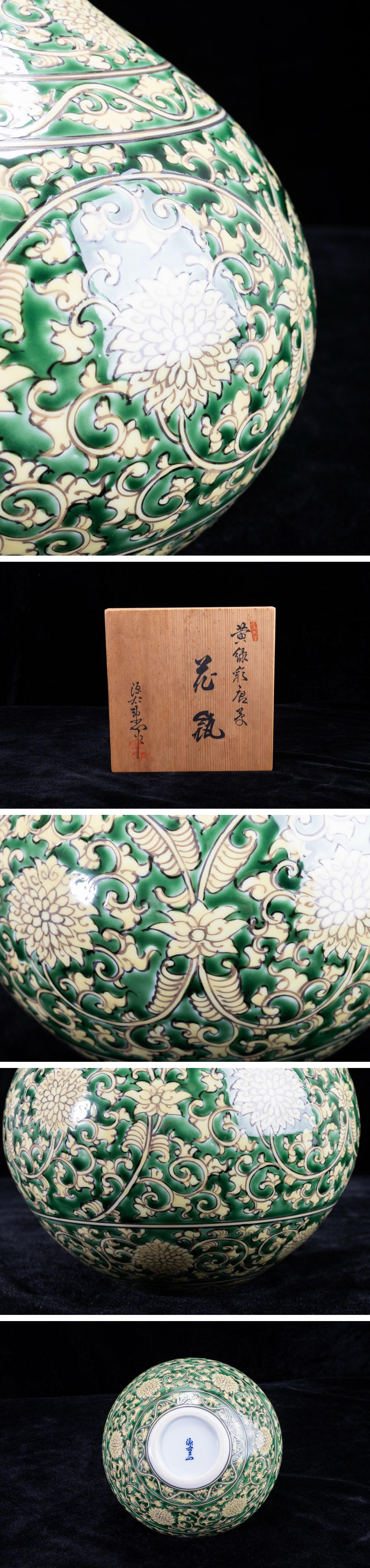 - 【珍品堂】1円から M90-V20 有田焼 館林源右衛門窯 黄緑彩唐草文 染錦 高25㎝ 共箱 木箱 飾壷 花瓶 名窯 工芸品 骨董品 古美術