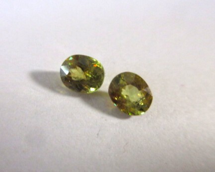 イエロー系スフェーンの1ペアです。赤やグリーンのファイアーがキラキラしています。透明感とテリがあります。非加熱。