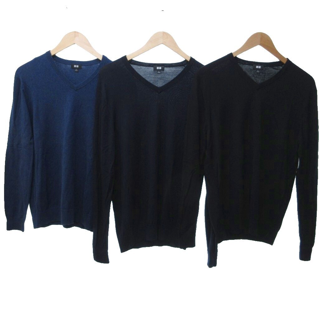 > ユニクロ UNIQLO ウール ニット 3点セット おまとめ セーター 長袖 Vネック 青 ブルー 紺 ネイビー 黒 ブラック L