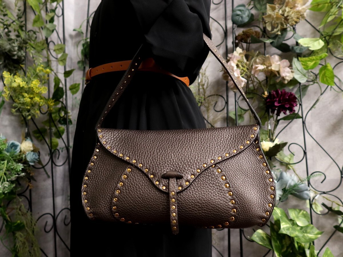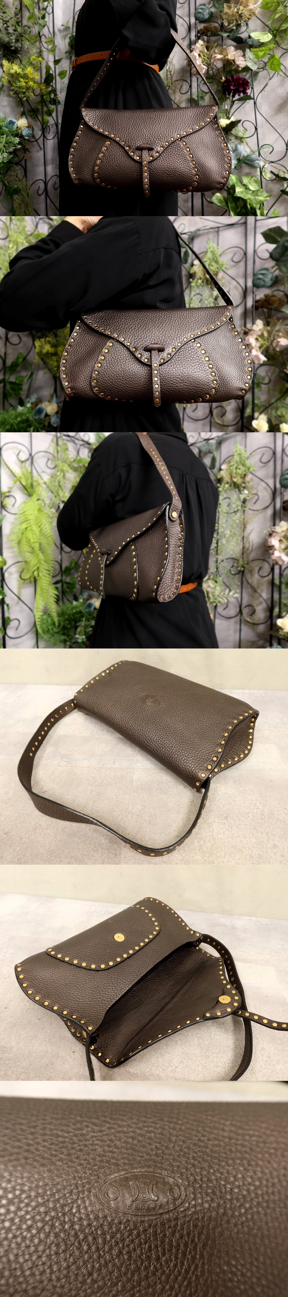 > ●超美品●CELINE セリーヌ●スタッズ●フラップ●カーフ レザー 本革●ワンショルダー バッグ●ブロンズ●ゴールド金具●肩掛け●Js61528