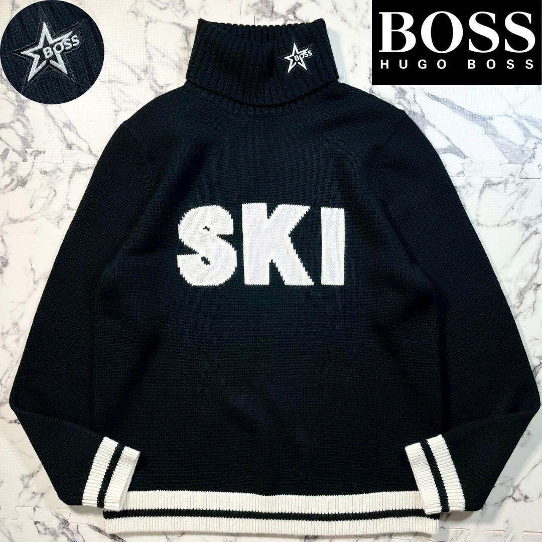 > 極美品/スター刺繍(XL)●HUGO BOSS タートルネック ウール100% ニット セーター 羊毛 ミドルゲージ ヒューゴボス ブラック 黒白 メンズ SKI