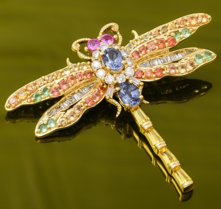 - K18 カラーガーネット・ルビー・サファイア・ダイヤモンド ペンダント (トンボモチーフ) 品番d23-365