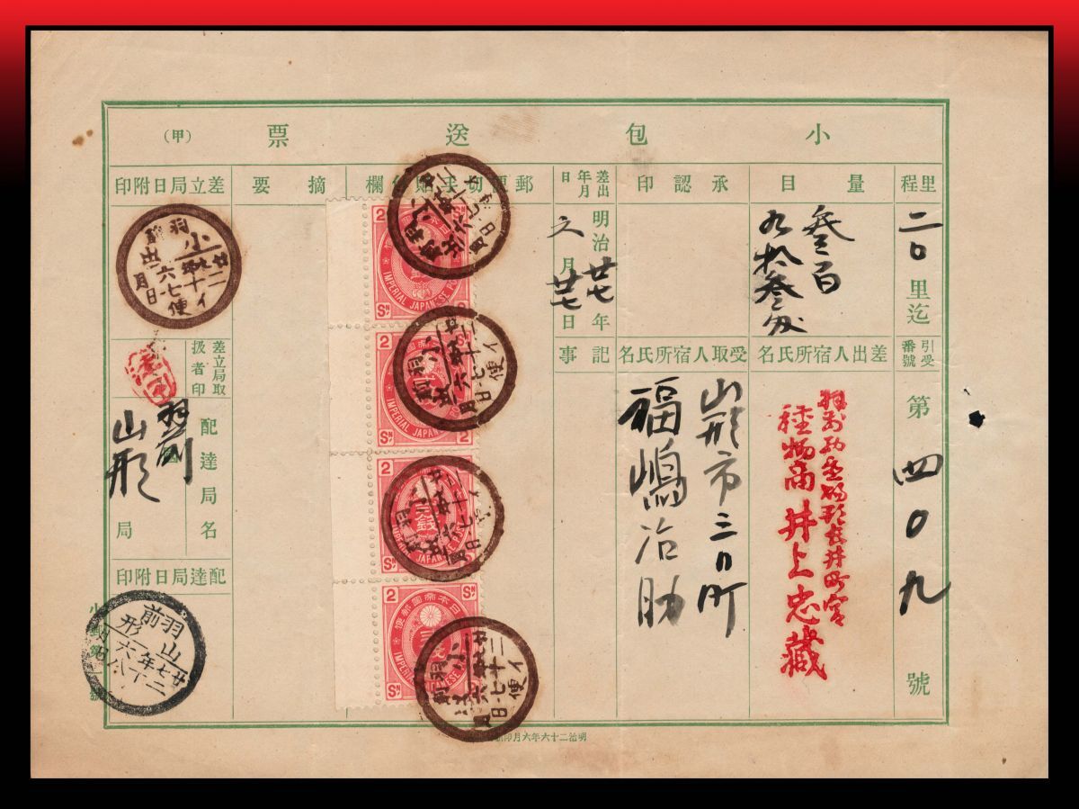 - Z5 U小判2銭縦4連/小包送票 差立局/トビ色丸一型印:羽前/小出/廿九年六月/二十七日/イ便 配達局印有り 折畳み定型発送