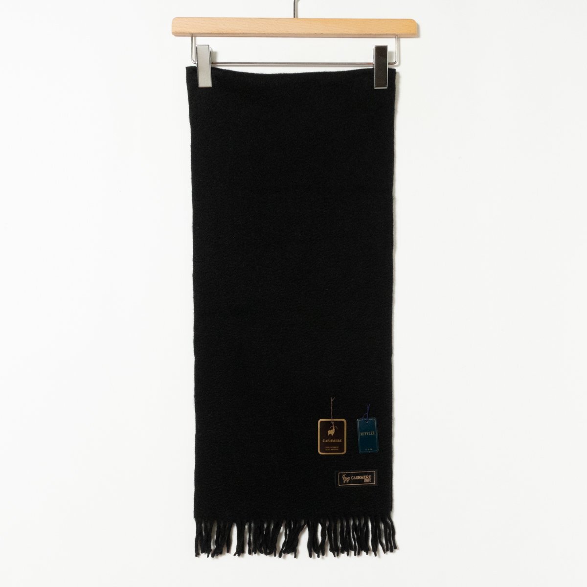 > タグ付き 美品 マフラー カシミヤ100% ブラック 黒 ユニセックス 男女兼用 日本製 フリンジ 無地 シンプル 定番 通勤 防寒 デイリー 冬