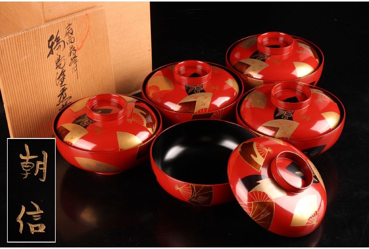- [URA]輪島塗/朝信 造/扇面蒔絵煮物椀5客/4-10-183 (検索)骨董/漆塗/漆器/吸物椀/煮物椀/蓋茶碗/蓋碗/蓋物/懐石料理/懐石道具