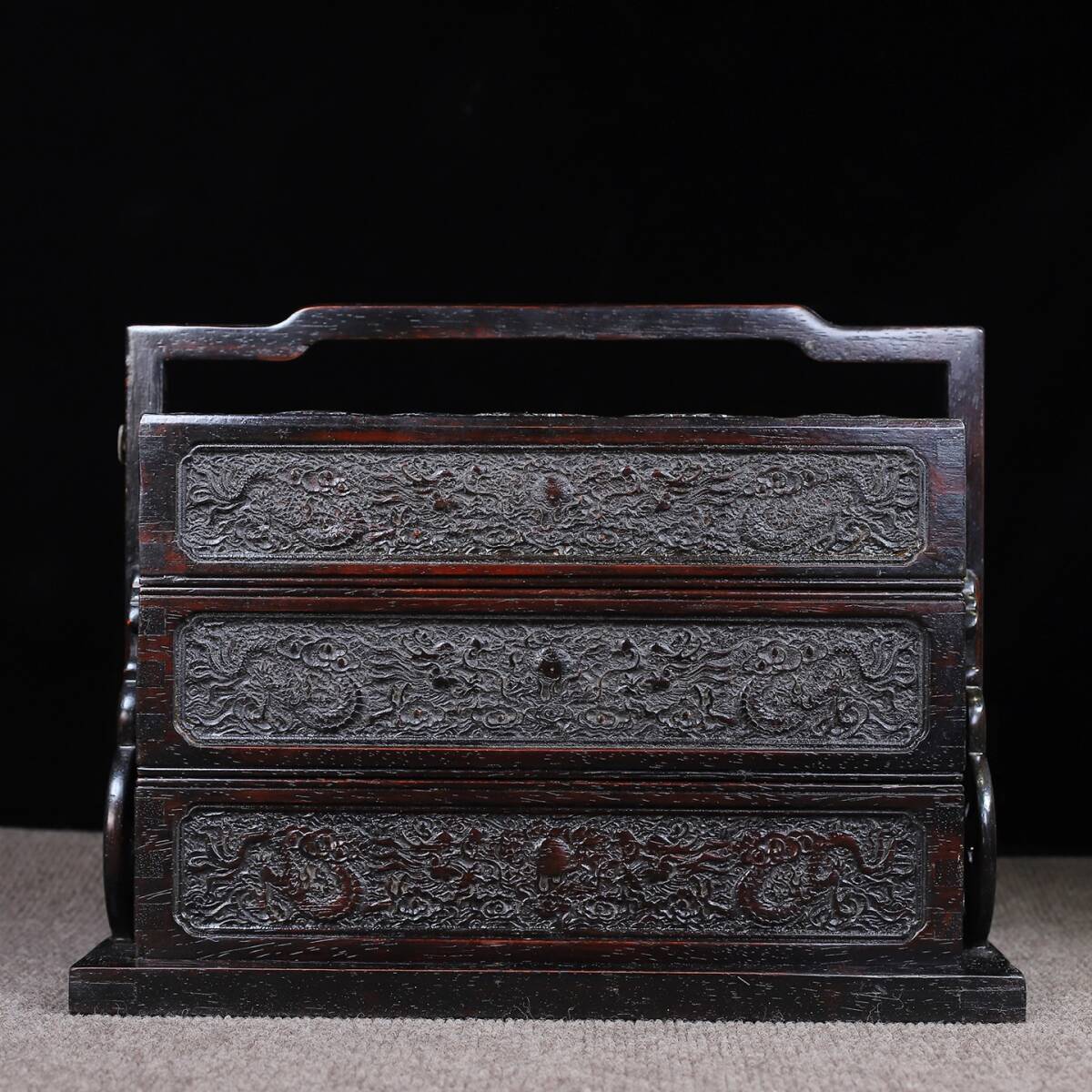 - 旧 清代 紫檀木 浮雕祥竜獻瑞 提梁多層盒 木製 中国古美術 古賞物 古置物 唐物 K710
