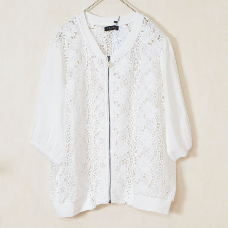 - フラワーレース七分袖ブルゾン パールチャーム付き L〜LL TRUBE N23-088 ホワイト