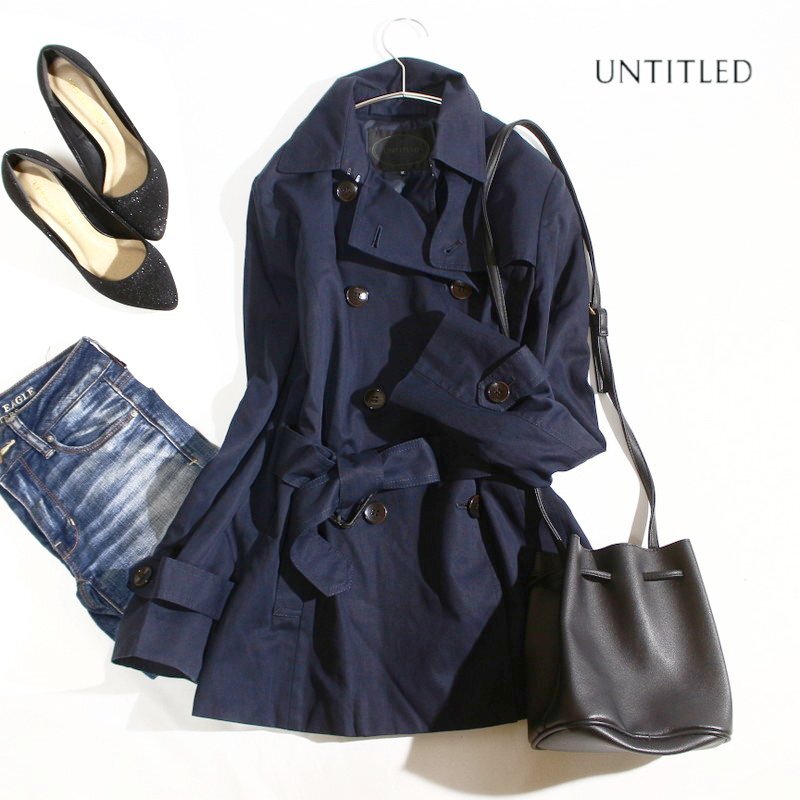 > 美品 アンタイトル UNTITLED 株) ワールド 秋 合物 定番 コットン 使いやすい ハーフ丈 クラッシック トレンチコート 9号 2 ネイビー 紺