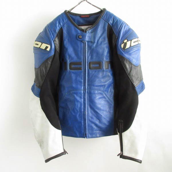 > ICON レザー レーシング ジャケット M 青黒白系 ライダース ベスト型キルティングライナー アイコン パンチングレザー D149-18-0080ZT