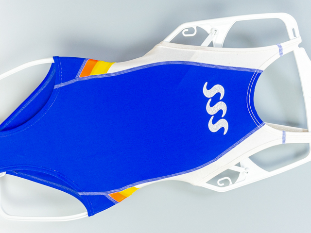 > 1067*【送料無料】*競泳水着*SSS*フライバック*ルートワン*日本製*ネーム入*120サイズ(J7)*ブルー×ホワイト×イエロー×オレンジ*USED♪