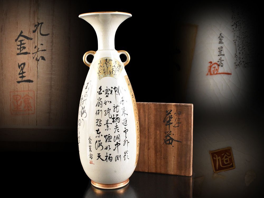 > 【雲】某名家買取品 九谷 田村金星造 梅細字紋耳付花瓶 高さ25.5cm 共箱 古美術品(花器華器花生飾壷)BY5613 LTgfd