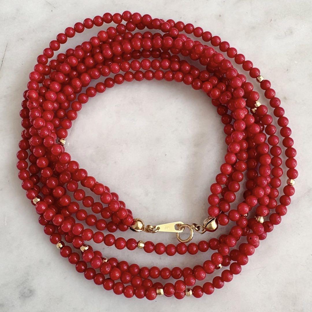 > ★天然赤珊瑚 本サンゴ K18 丸玉4連ネックレス カットボール レッドコーラル 4mm珠