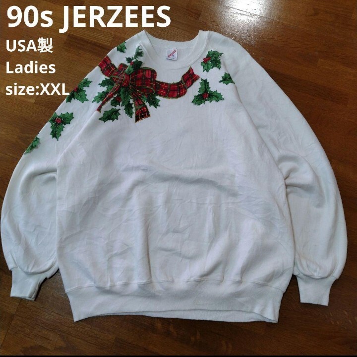 > 【訳あり】 vintage 90s JERZEES USA製 ラグランスウェット ホワイト クリスマス Ladies size:XXL USA古着