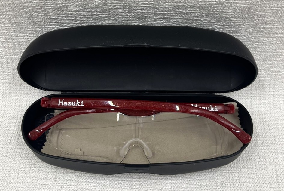 - 【S324】Hazuki/ハズキ/ルーペ/1.32倍/MADE IN JAPAN/ラメ×赤フレーム/クリアレンズ/ケース付き/拡大鏡/老眼鏡/中古