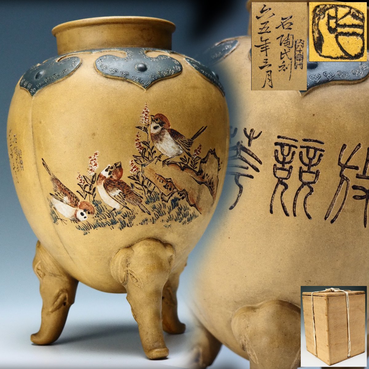 > 【治】『石陶氏』刻 中国古玩 漢詩色絵竹雀彫 象脚黄泥花瓶☆箱付 高さ 20.6cm (検索:中国宜興 壷 朱泥 花器 花入 置物 紫砂 唐物) FM60