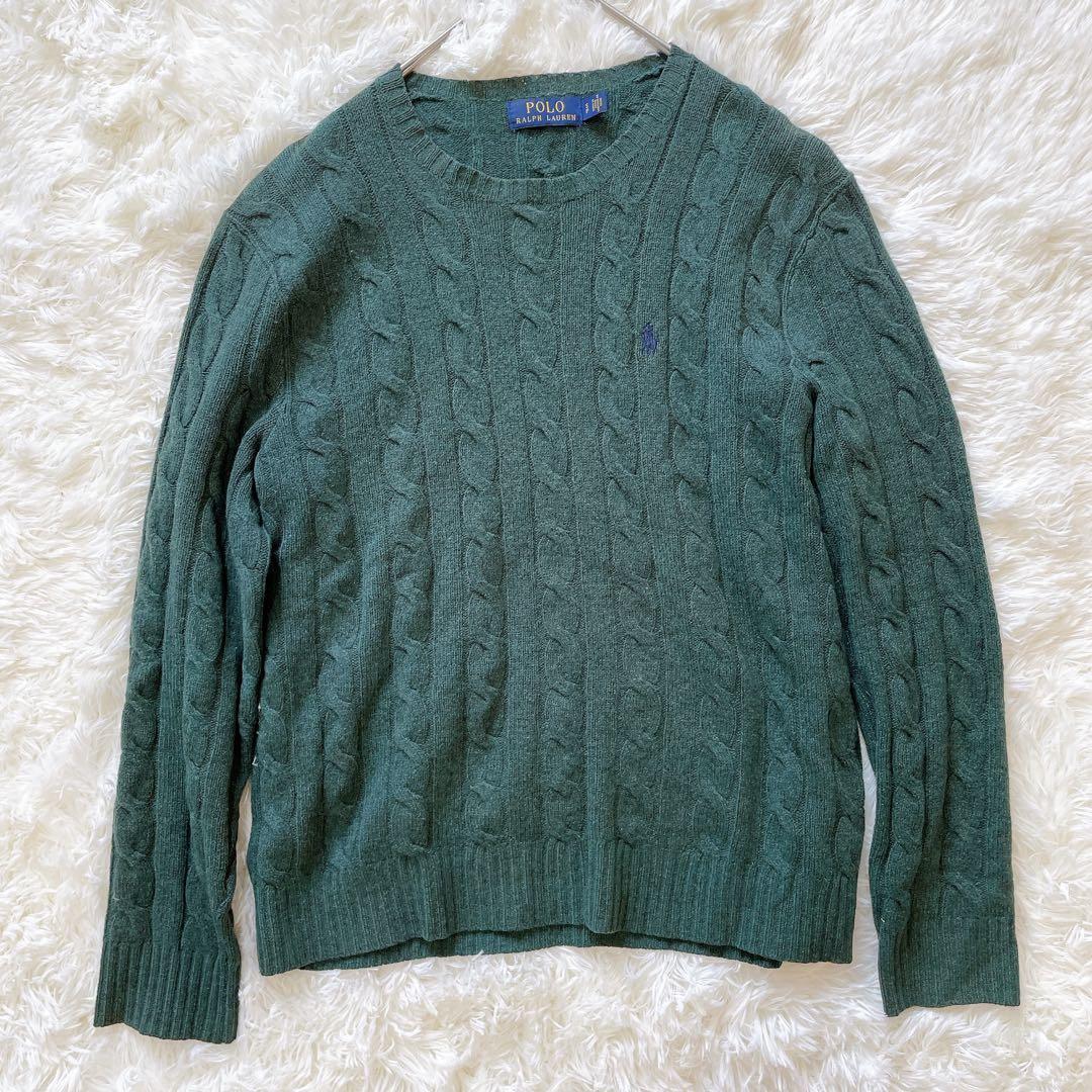 > POLO RALPH LAUREN ポロラルフローレン ケーブルニットセーター クルーネック Sサイズ グリーン ポニー刺繍 ワンポイント メンズ