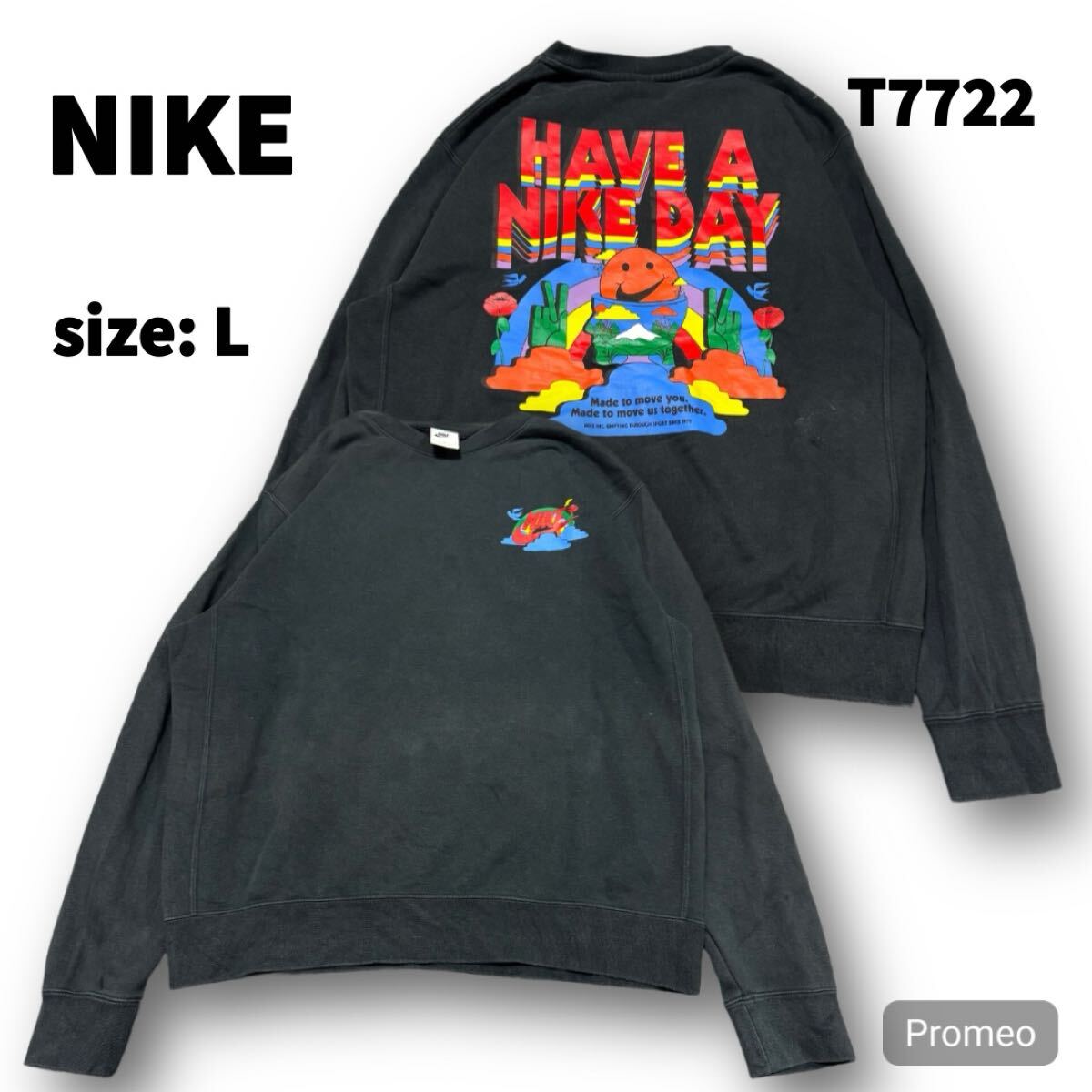 > 【T7722】 NIKE ナイキ スウェット トレーナー サイズL ブラック 黒 レインボー バックプリント メンズ トップス 最落なし 古着