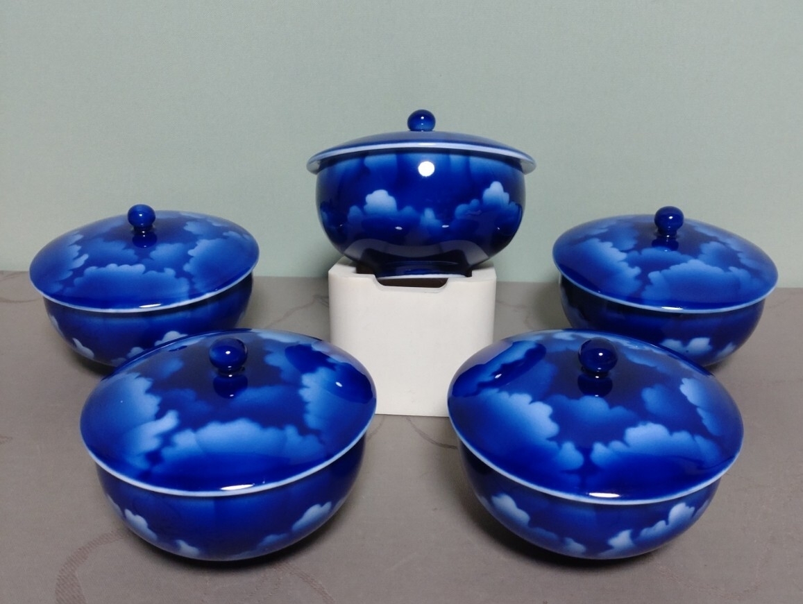 - ★★『深川製磁』瑠璃牡丹《蓋付湯飲み5客》 ☆未使用・長期保管品☆ ★★