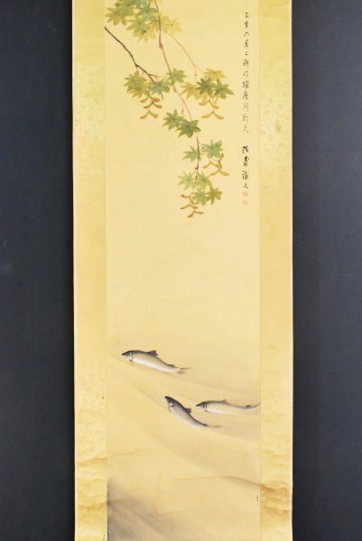 > K5621 模写 瑞甫徹人「楓清流群鮎図」絹本 合箱 香魚 アユ 鮎 日本画 絵画 中国 茶掛 掛軸 掛け軸 古美術 人が書いたもの