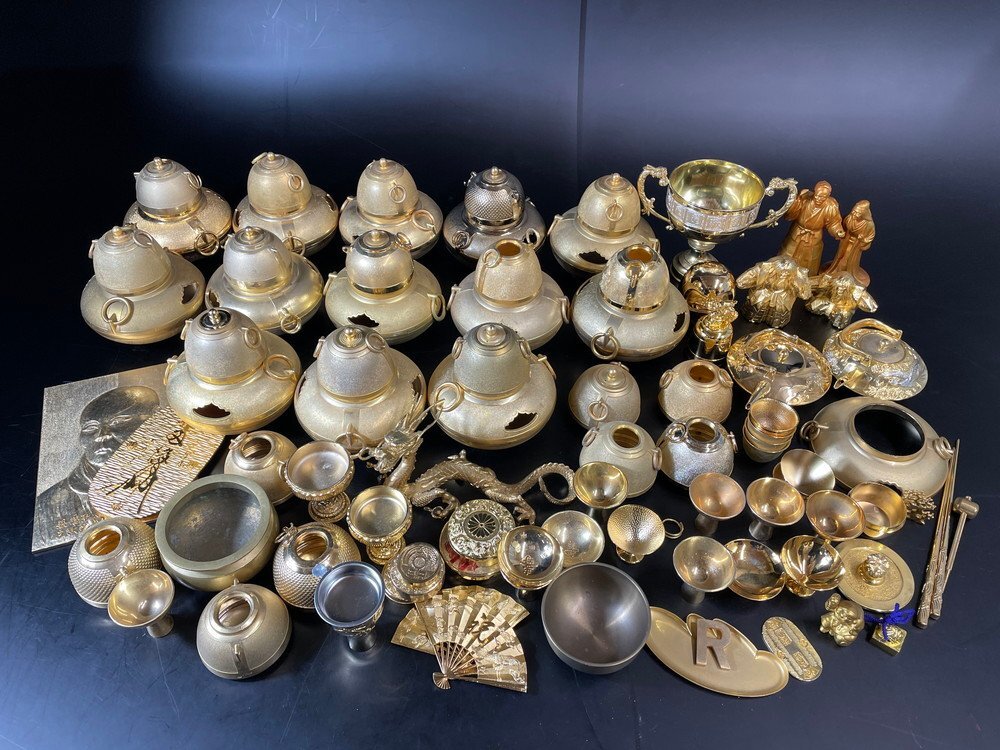 - 【25P3568】1円スタート 金属工芸品 置き物 24KGP 金メッキ 銀メッキ 約23kg以上 まとめ 急須 香炉 ゴールドカラー 金色 縁起物 現状品