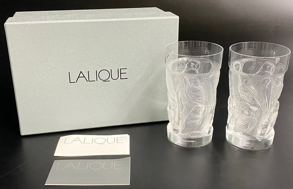 > 【6P3785】1円スタート LALIQUE ラリック クリスタル ペアグラス 2客 口径約7.5cm×高さ約13cm タンブラー フクロウ 箱付き 洋食器 現状品