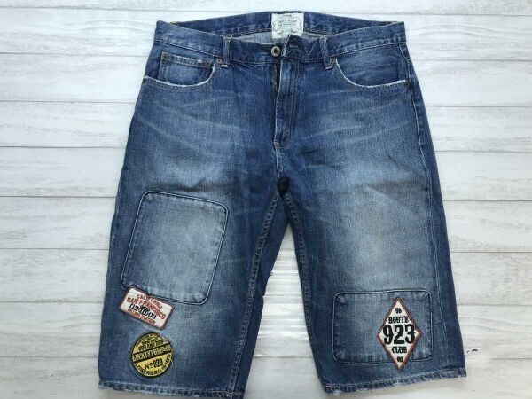 - LUCKY STORE ラッキーストア メンズ サーフ ワッペン リペア加工 七分丈 デニム ショート ハーフ パンツ ボトムス ジーンズ 綿100% 34 青