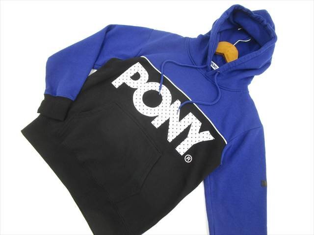 > 美品 ポニー PONY 長袖 裏起毛プルオーバーパーカー M ブルー系地 ホワイト 英字プリント&ブラック スター柄