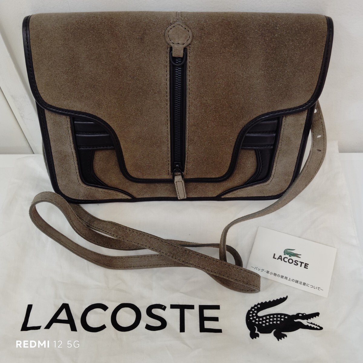 - 美品 LACOSTE ラコステ スエード ショルダーバッグ カーキ ブラック レザー 鞄 斜め掛け メンズ 普段使い フロントジップ