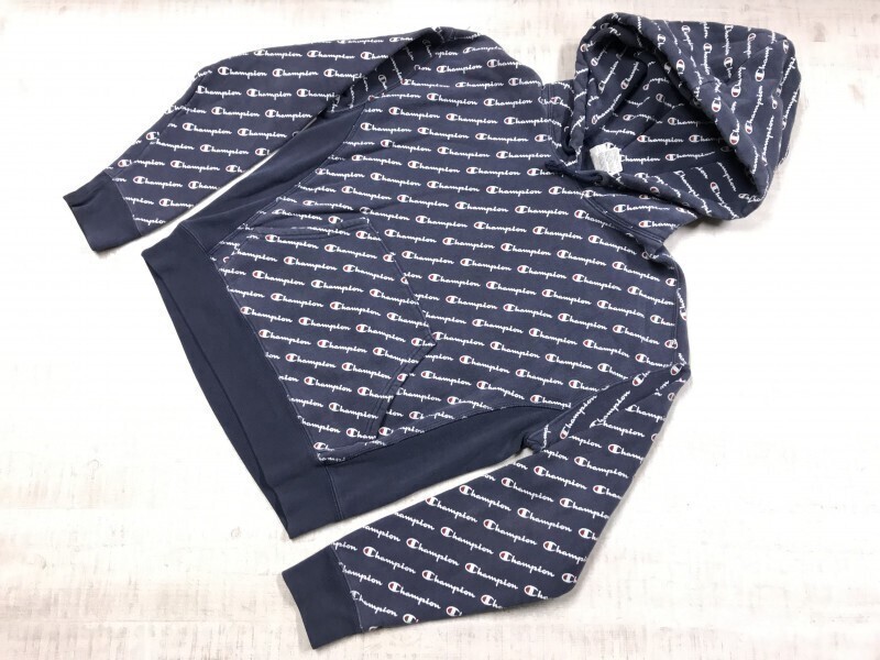 > チャンピオン リバースウィーブ Champion REVERSE WEAVE ロゴ総柄モノグラム アメカジ プルオーバー スウェット パーカー レディース M 紺
