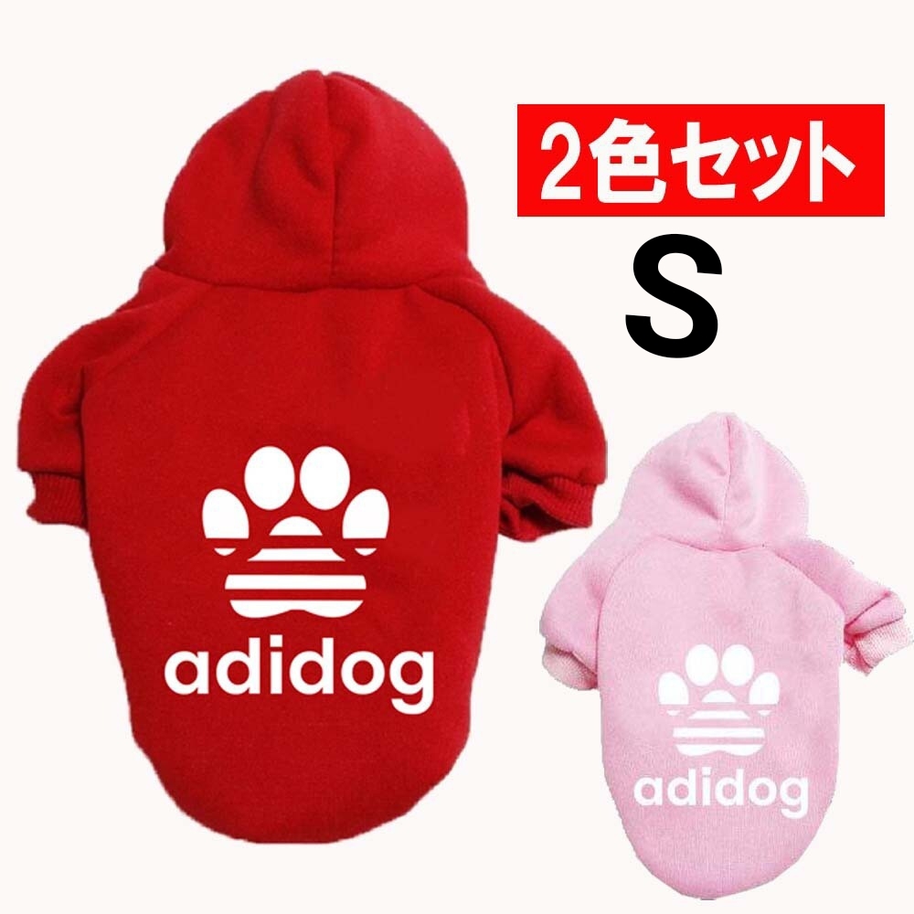 - S レッド、ピンク 犬服 2色セットアディドッグ肉球パーカー 裏起毛パーカー裏起毛あったかい