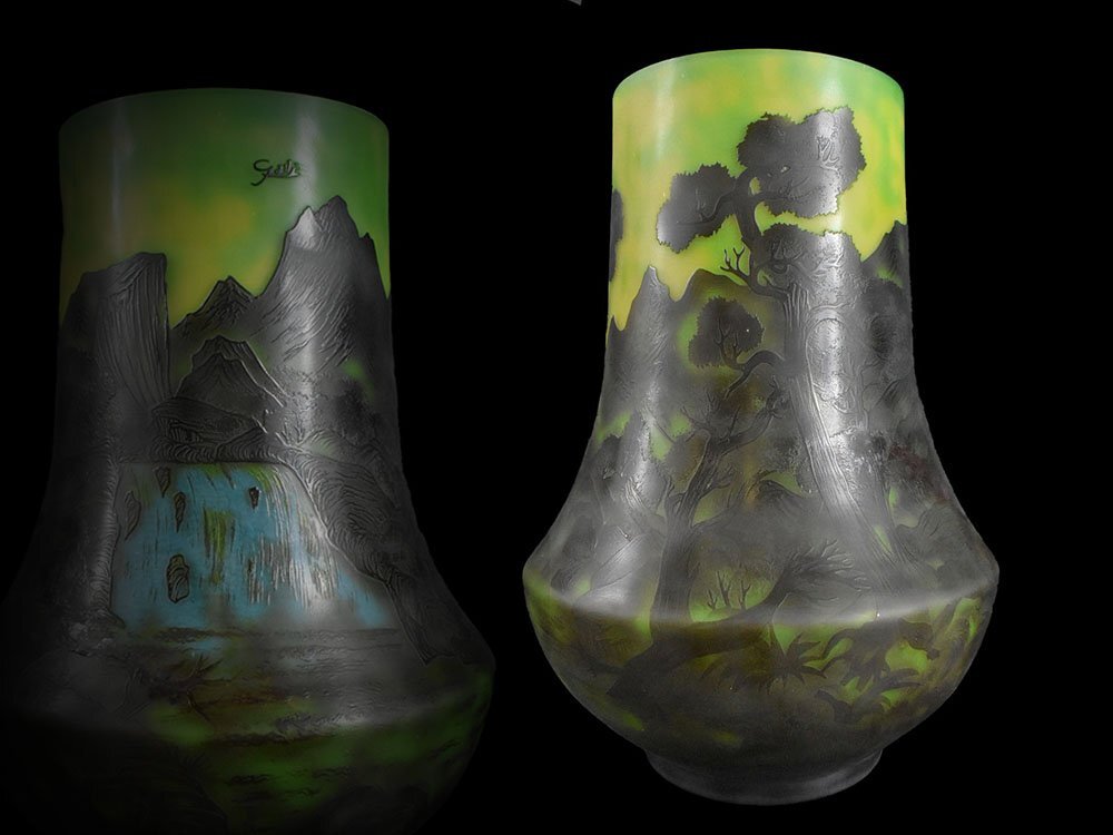 > 【雲】エミール・ガレ Emile Galle 山水風景彫刻ガラス花瓶 高さ53.5cm 古美術品(被せガラスアールヌーヴォー)J1969 DTfre LTDgyt