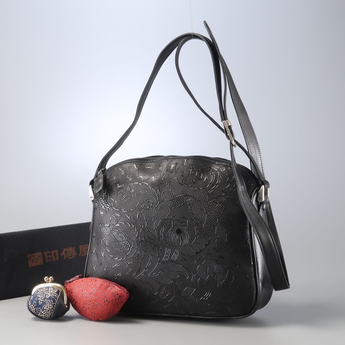- MI2207▲印伝屋/印傳屋/インデンヤ 鹿革 黒漆 キャレー Carra 妖精/花柄 レザー ショルダーバッグ ポシェット 斜め掛け 鞄 ブラック