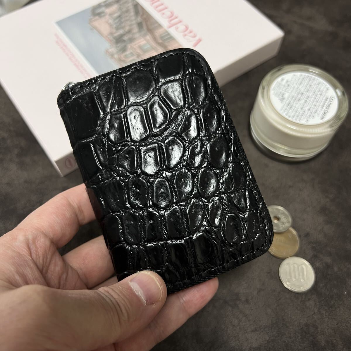 - 実物一枚革 黒 クロコダイル財布 ラウンドファスナー ワニ革 鰐/本革 手染め手作り ミニ財布 コンパクト 人気