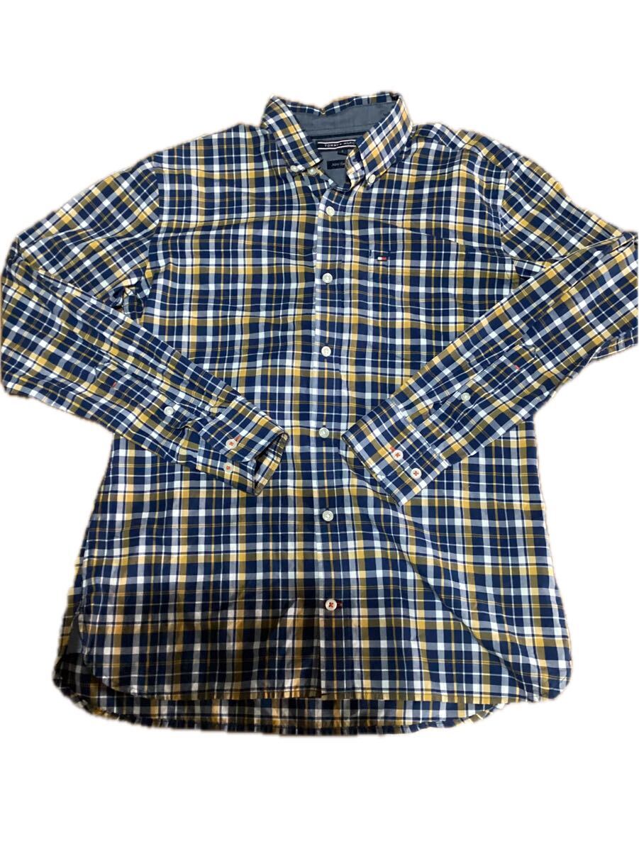 - TOMMY HILFIGER トミーヒルフィガー チェックシャツ ボタンダウン コットン100% ネイビー×イエロー系 メンズS New York Fit 長袖シャツ