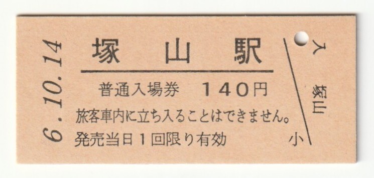 - 平成6年10月14日 信越本線 塚山駅 140円硬券普通入場券(日付印刷)
