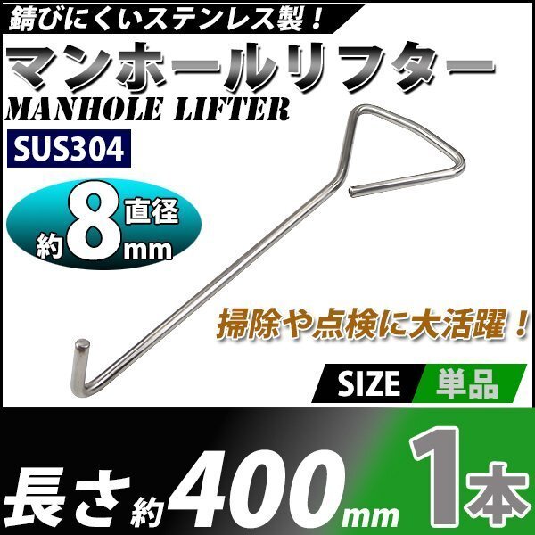> 送料無料 マンホールリフター 1本 ステンレス製 ハイグレードモデル SUS304 直径約8mm 長さ約400mm マンホール グレーチング フック