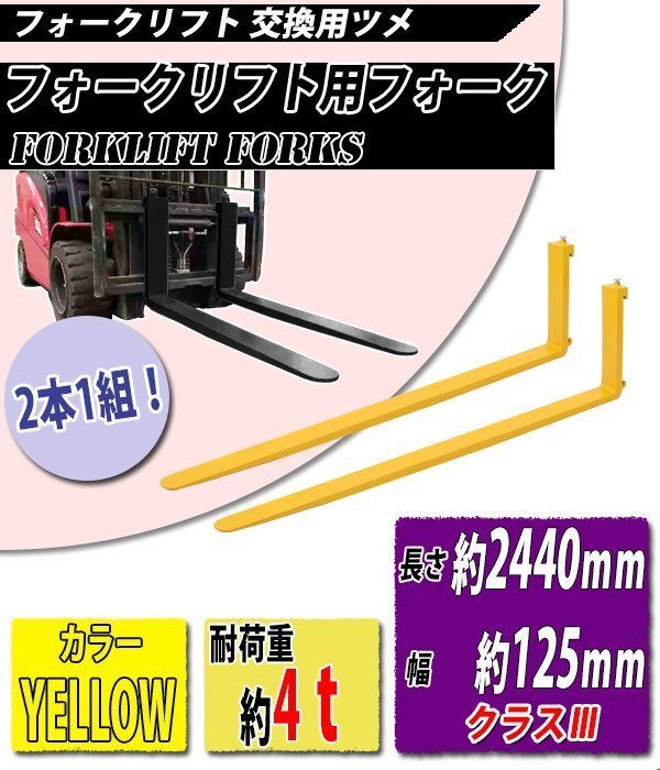 > フォーク 爪 2本セット 黄 長さ約2440mm 幅約125mm 耐荷重約4t 厚さ約50mm フォークリフト用 交換用 フォーク ツメ 運搬 荷役 イエロー